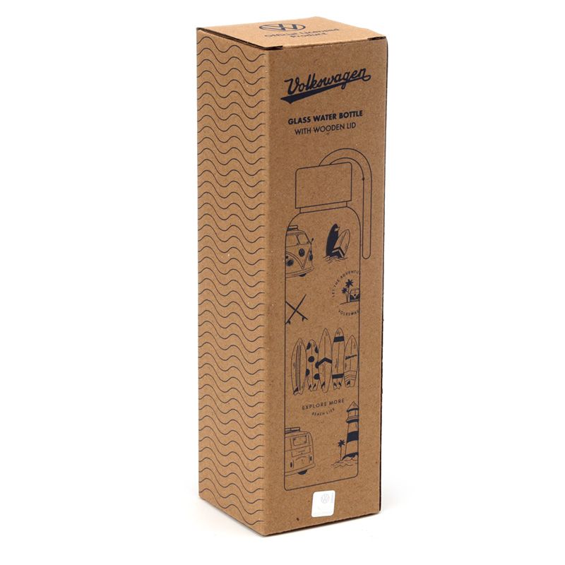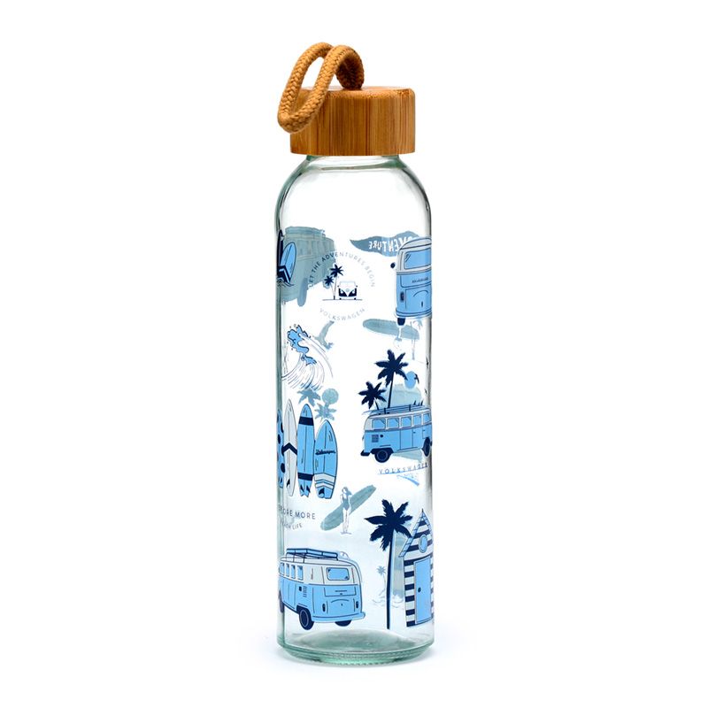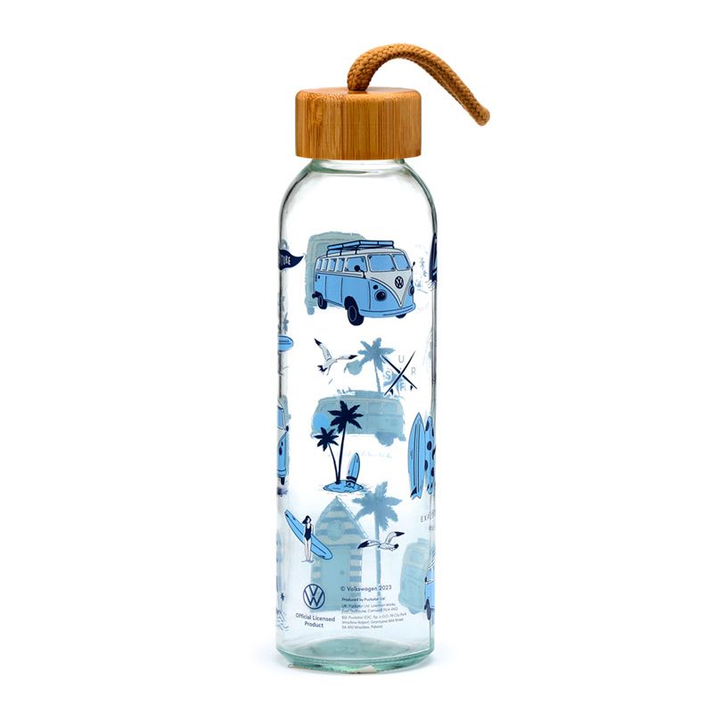VW Volkswagen T1 Camper Bus Explore More 500ml Återanvändbar Vattenflaska i Glas med Bambulock