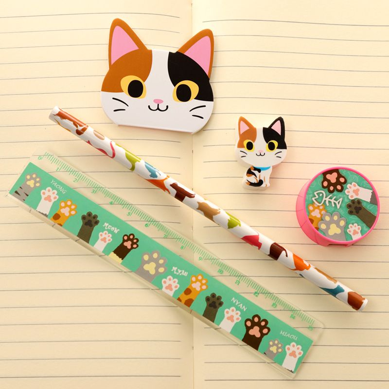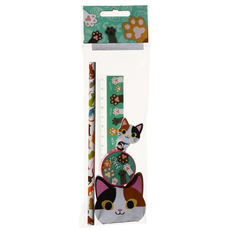 Mer Information | Mått | Linjal 15cm Penna Längd 17.5cm Suddgummi 3x2.5x0.5cm Pennvässare 1x3.5x3.5cm Anteckningsblock 5x5cm |