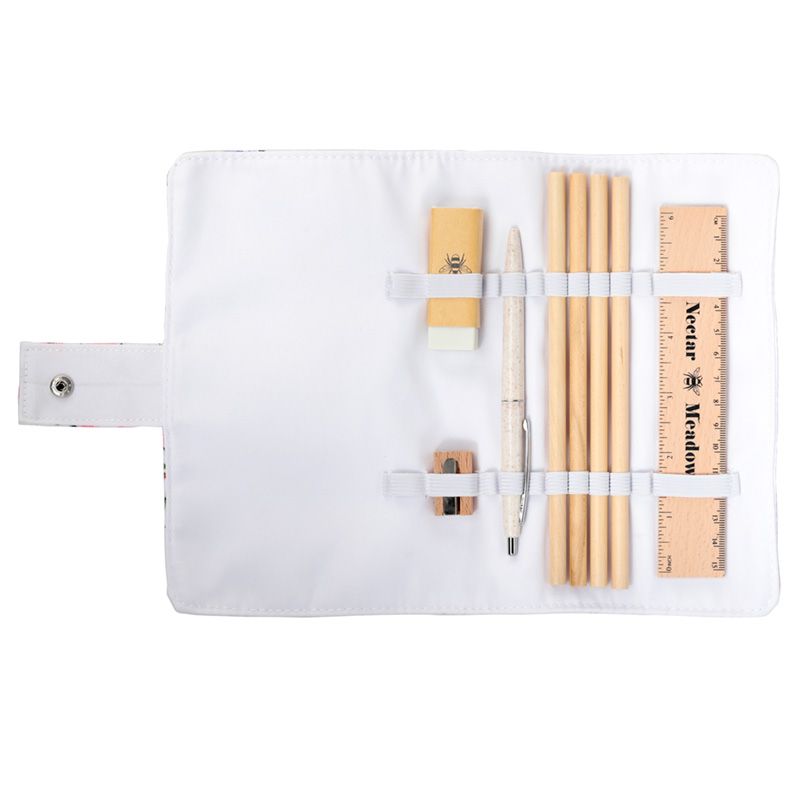 - Material: Hållare i RPET Återvunna Plastflaskor, Metall Popper, Trälinjal och Pennvässare, Vetestrå-Penna och Suddgummi